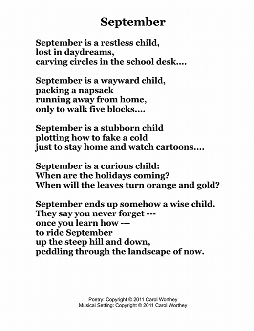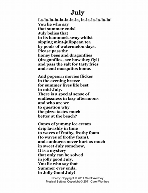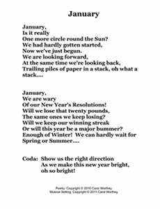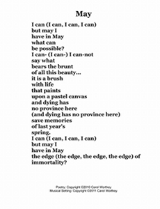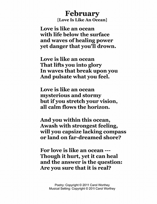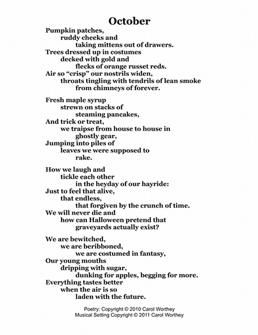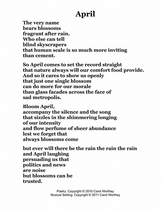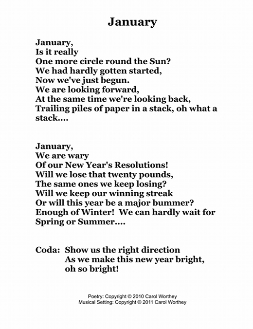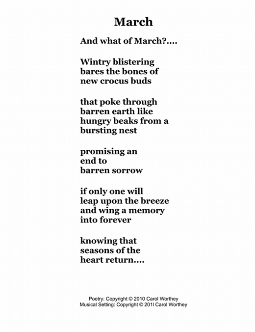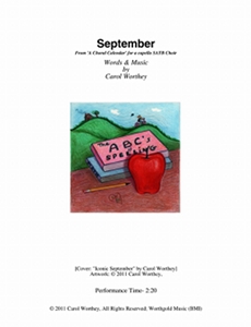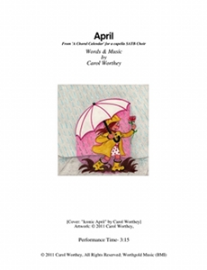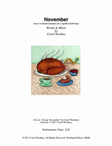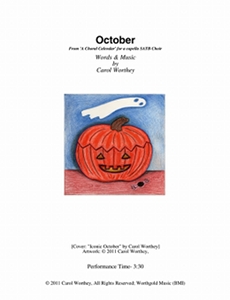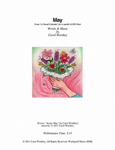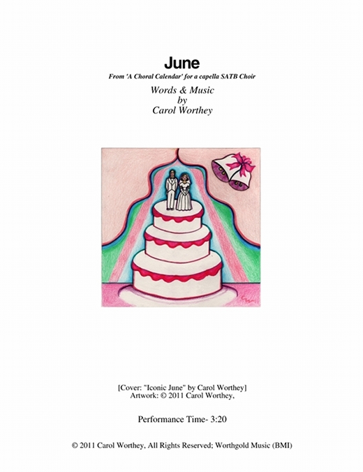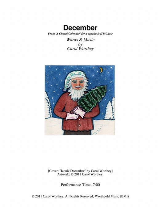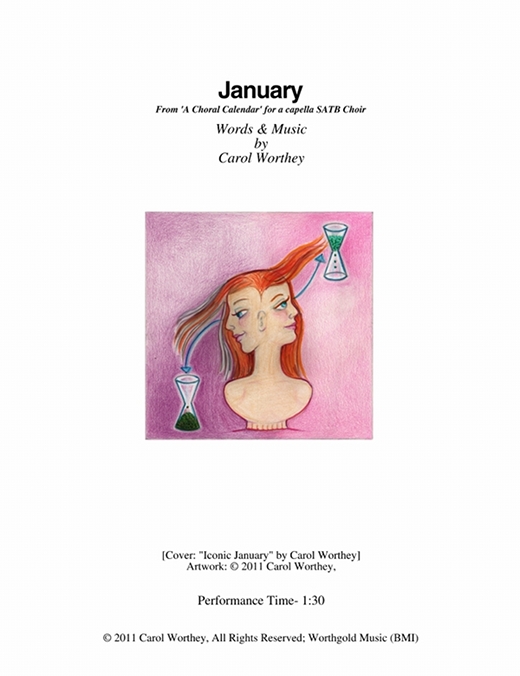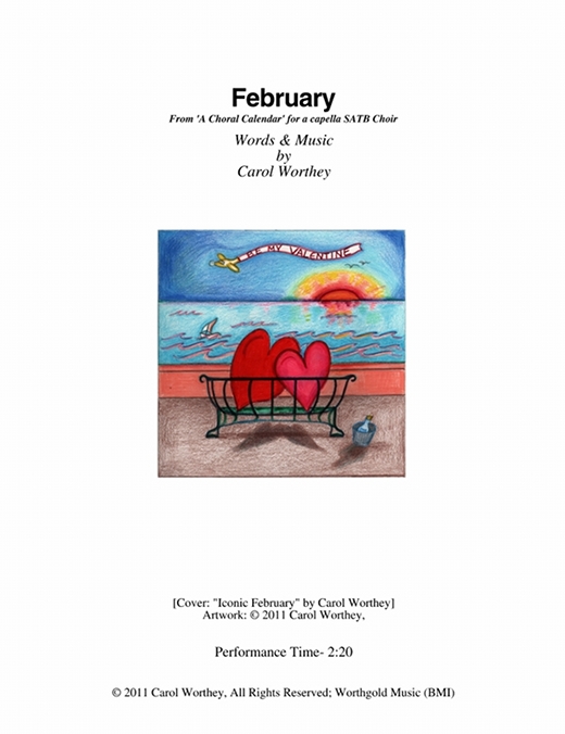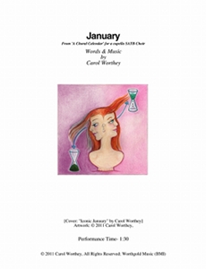 Composer/Painter/Writer Carol Worthey is proud to announce the "birth" of a new major work for choir: Twelve musical portraits of each month painted in musical colors and textures that depict the characteristic moods, changing weather, special holidays and unique feeling of each month. "A Choral Calendar" is a uniquely flexible work in its performance possibilities: It is designed to function enjoyable as a whole concert piece, with each stylistically distinct month flowing one to the next until an entire year is portrayed in music, in artwork and in verse. It is also a multi-faceted set of pieces, each unique, that can function with each month being performed by itself as the year passes, or for special occasions such as a Holiday, a Wedding or to celebrate a Birthday during any particular month.